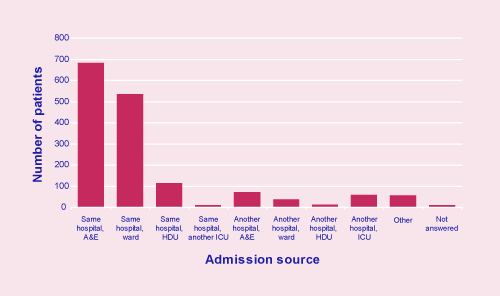 Source of admission to the ICUOf patients admitted to the ICU, 43% (683/1,596) were admitted from the accident and emergency department of the same hospital and 537/1,596 (34%) were admitted to the ICU from a ward in the same hospital. Figure 4 demonstrates the range of admission sources as detailed on the intensive care questionnaire.