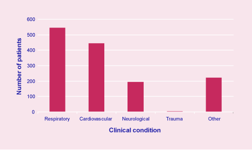 Figure 4. Source of admission to the ICU n=1,596 Figure 5 shows that the most common clinical reason for referral to ICU was respiratory disease, followed by cardiovascular and neurological disease. This data was taken from the ICU questionnaire.