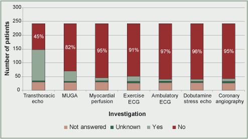 All patients would have had a clinical examination and a 12 lead ECG. Anaesthetists were asked to indicate whether elective patients had received more sophisticated cardiac investigations. Emergency admission patients were excluded because it would have been unlikely that there would have been time to organise these sorts of investigations. For this analysis the figures do include patients who went on to have endovascular repair. Patients may have had more than one preoperative investigation. The results for large and for intermediate sized vascular units are shown in Figures 1 and 2. Only three cardiac investigations were reported from remote units, all being transthoracic echocardiography. In 14% (67/477) of questionnaires no data was available as to whether any investigations had been performed or not. Transthoracic echocardiography was the most common investigation being used in 60% (244/410) of cases overall. The NCEPOD advisors suggested that it is relatively easy to obtain a transthoracic echocardiography investigation for a vascular patient compared to the other investigations listed. The advisors were of the opinion that the test was helpful as an estimate of ventricular function and as a means of excluding unsuspected valvular disease, although there is little published evidence that the use of echocardiography affects outcome. It was thought that echocardiography was indicated in most aneurysm patients when it was not possible to judge ventricular function by simple clinical tests (e.g. the ability to climb two flights of stairs). Other investigations were utilised to a small extent in the large units, but hardly at all in intermediate units. This may indicate greater difficulty in accessing sophisticated investigations at intermediate sized units. NCEPOD did not have enough information to calculate the cardiac risk for each individual patient so it was not possible to make an overall judgement as to whether the investigations were appropriate or not. The anaesthetist was asked, if an investigation had been performed, whether or not they judged that the results of the investigations had affected the management of the patient. Table 5 details the numbers of tests, for all sizes of unit, which were regarded as affecting management.