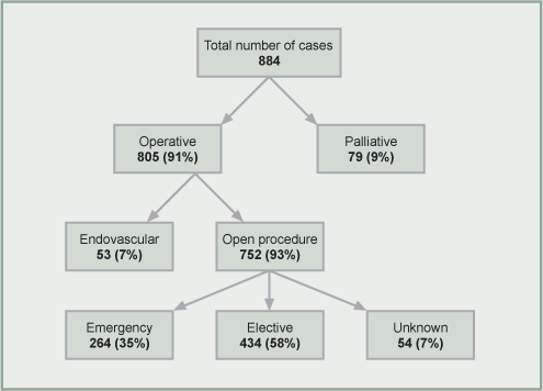 PopulationFigure 1 demonstrates how the sample population was divided between procedure and admission type. It can be seen that in this study the majority of cases underwent a repair of their aneurysm; in only 9% (79/884) was a decision made not to operate or the patient died before receiving surgery. Of the repairs performed, 93% (752/805) were done by an open surgical procedure and more commonly as an elective procedure. |