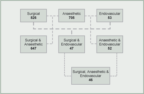 Data receivedFigure 2 provides an overview of the number of clinical questionnaires returned. More surgical questionnaires were returned as some of these would have been completed by the admitting consultant when a patient died before being seen by the surgeon and anaesthetist. |