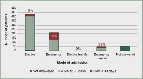 Figure 1. Mode of admission by outcome n=752. Percentages refer to patients who died in hospital within 30 days.