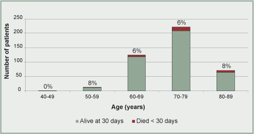 Figure 3. Age by mortality n =432/434. Percentages refer to patients who died in hospital within